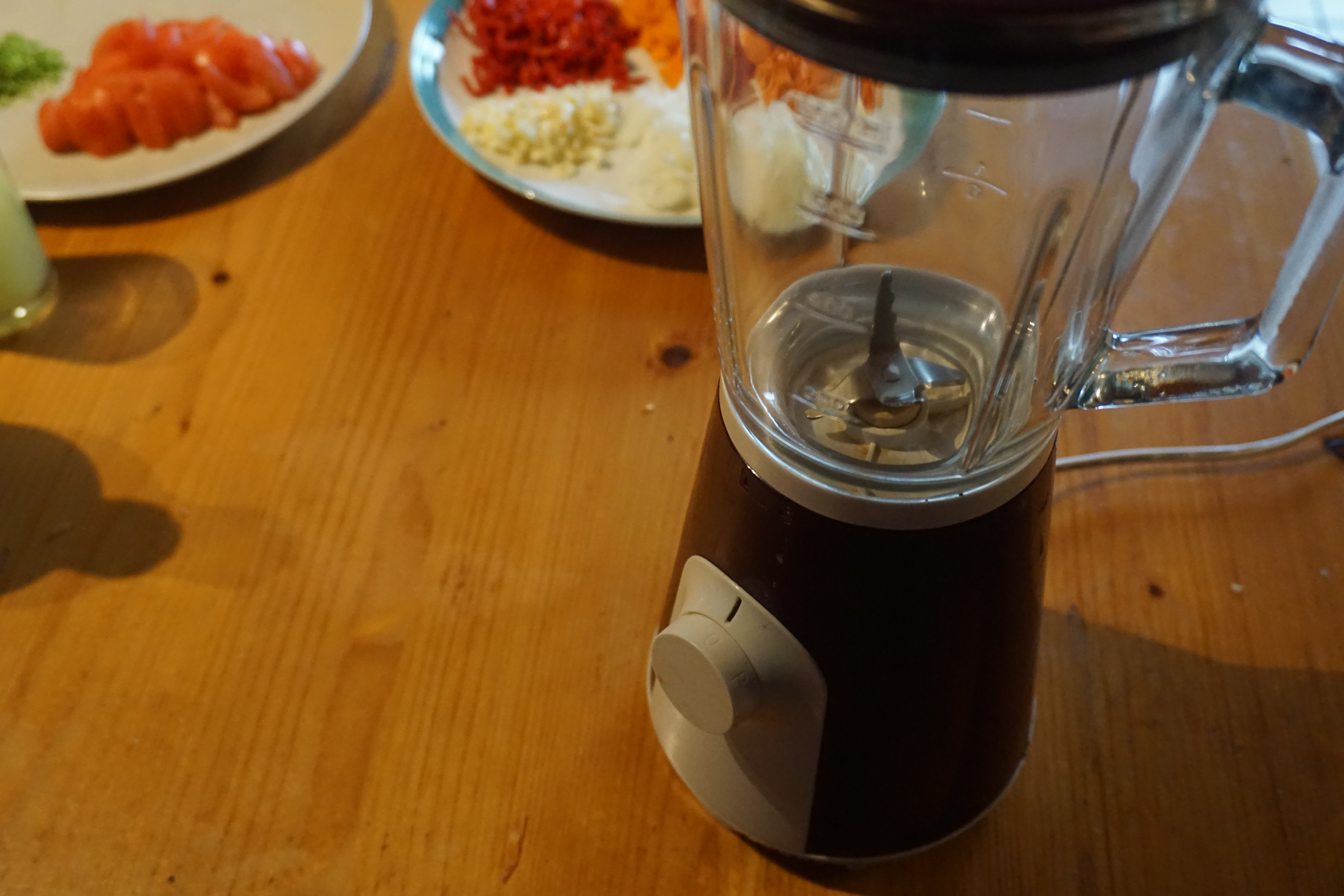 Danach alle Zutaten in den Mixer und kleinpürieren. Das Wasser vll erstmal nur die Hälfte, jenachdem wie die Konsistenz dann ist kann man immer noch mehr Wasser hinzugeben.