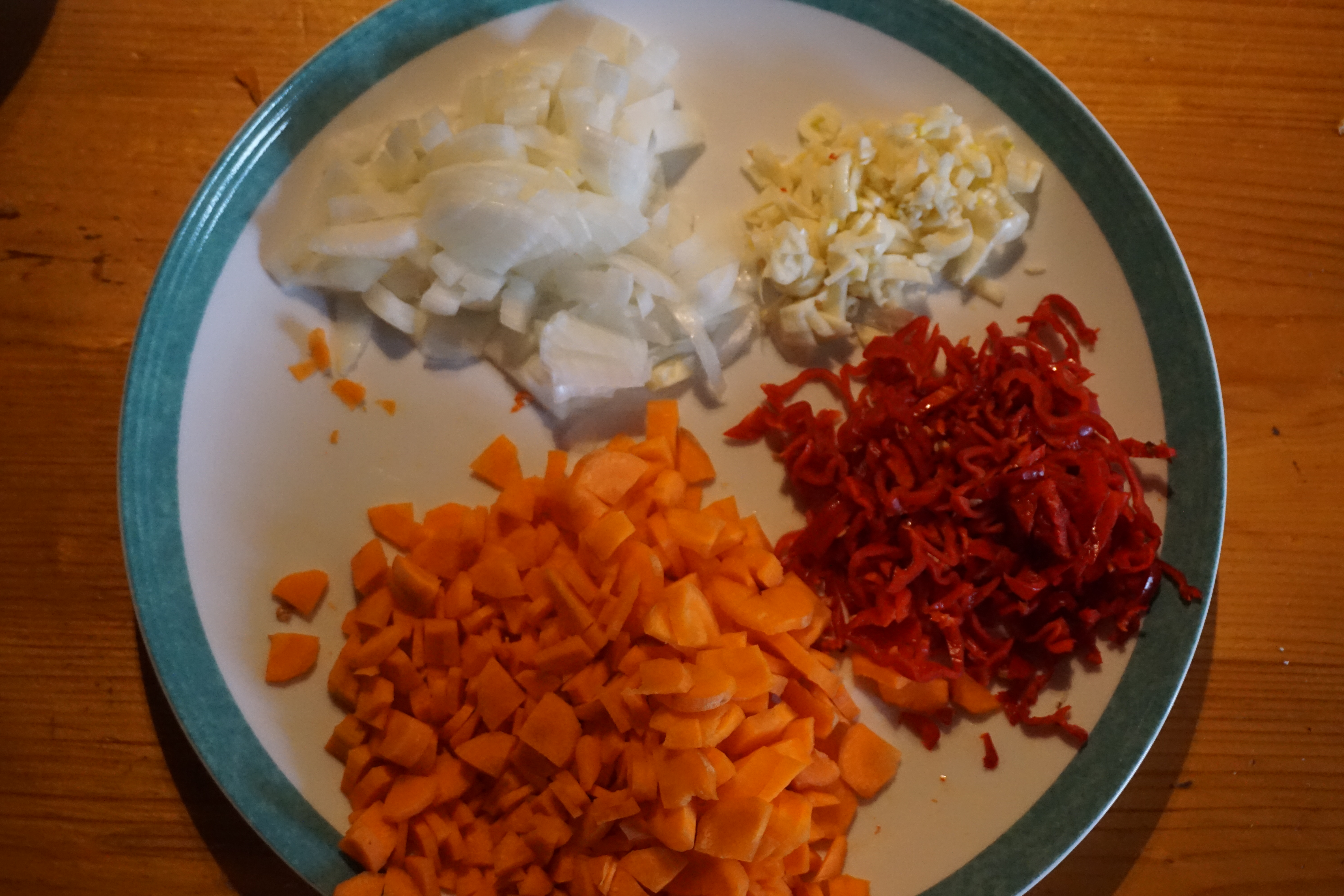 Jetzt werden die Zwiebel, die Karotten, die Habanero und die Knoblauchzehen kleingehackt. Die Tomate wird gestückelt, aus den Limetten reiben wir die Schale ab bis so ca. 1 Esslöffel geriebene Schale vorhanden ist.