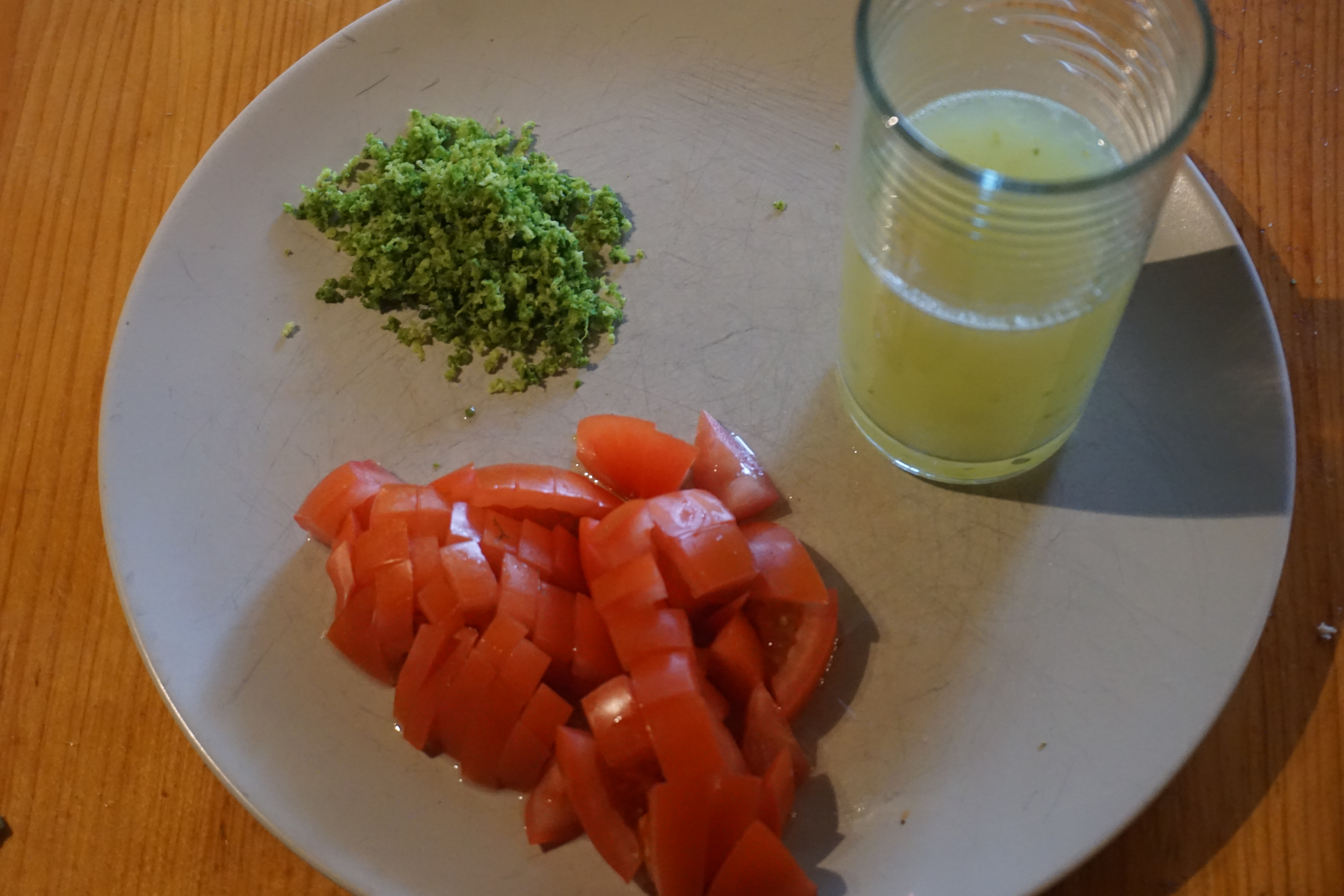 unsere gehackten Habanero, die gestückelte Tomate, die geriebenen Limettenschalen und die 60 ml Limettensaft kommen hinzu. Auch benötigen wir noch ca. 60 ml Wasser und 60 ml Essig, welches