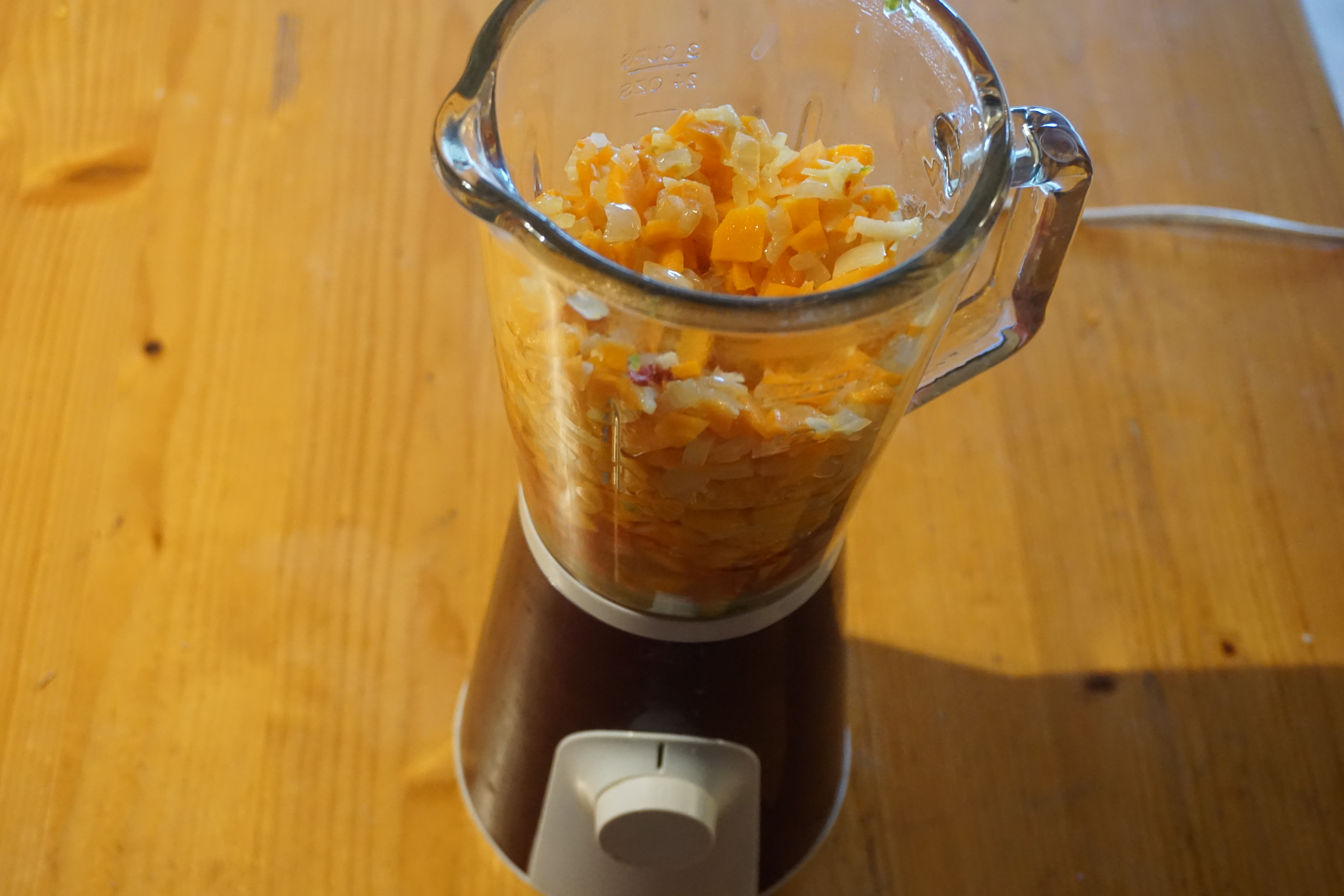Jetzt dünste ich die gehackten Karotten, Zwiebeln und den gehackten Knoblauch kurz an. Danach kommt es in einen Mixer und auch die restlichen Zutaten, also