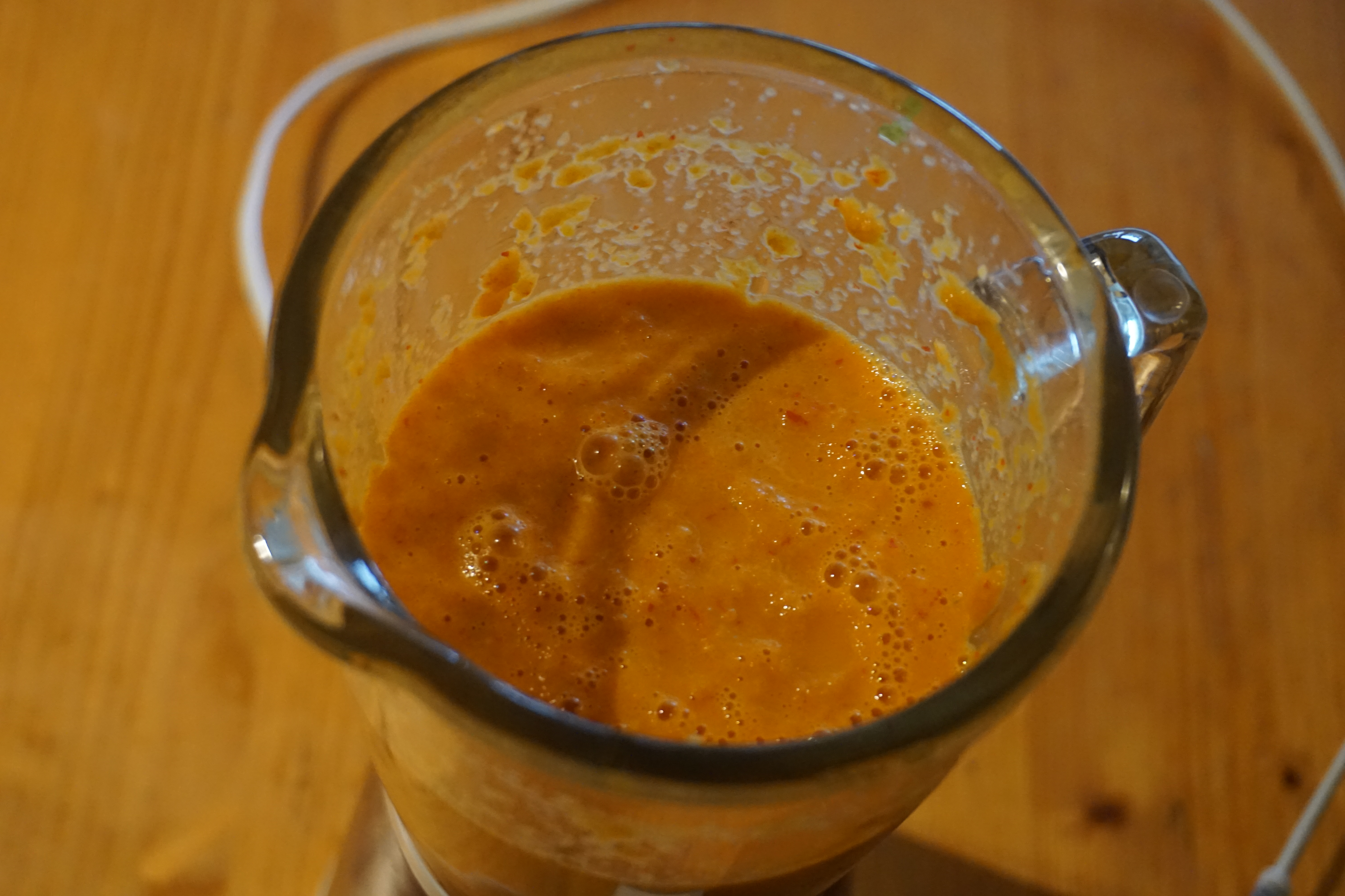 Danach alle Zutaten in den Mixer und kleinpürieren. Das Wasser vll erstmal nur die Hälfte, jenachdem wie die Konsistenz dann ist kann man immer noch mehr Wasser hinzugeben.