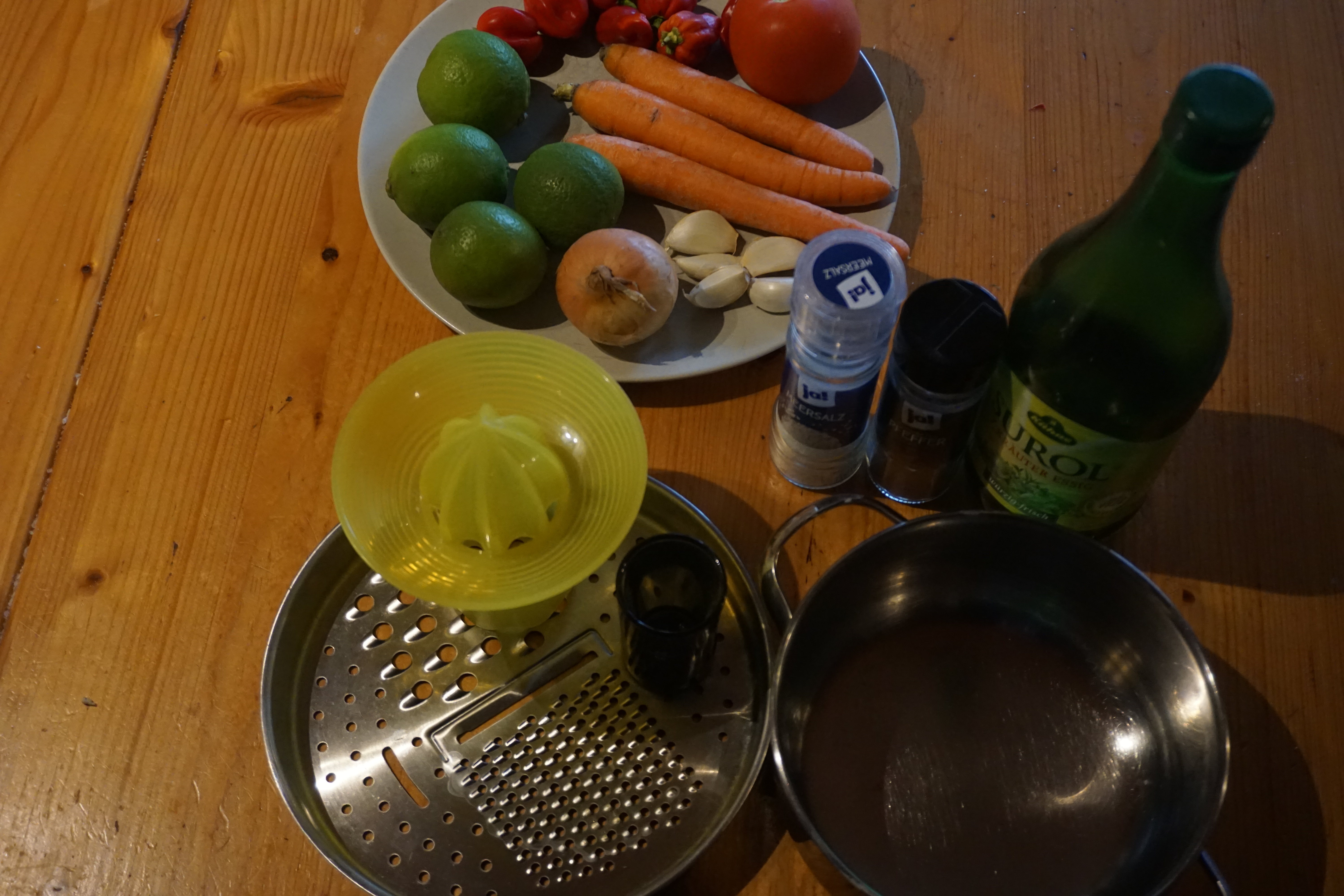 Jetzt legen wir aber wirklich los! Zunächst einmal benötigen wir so 6-8 Habanero, 2-3 Karotten, eine Tomate, eine Zwiebel, 5 Knoblauchzehen, 4 Limetten aus denen wir