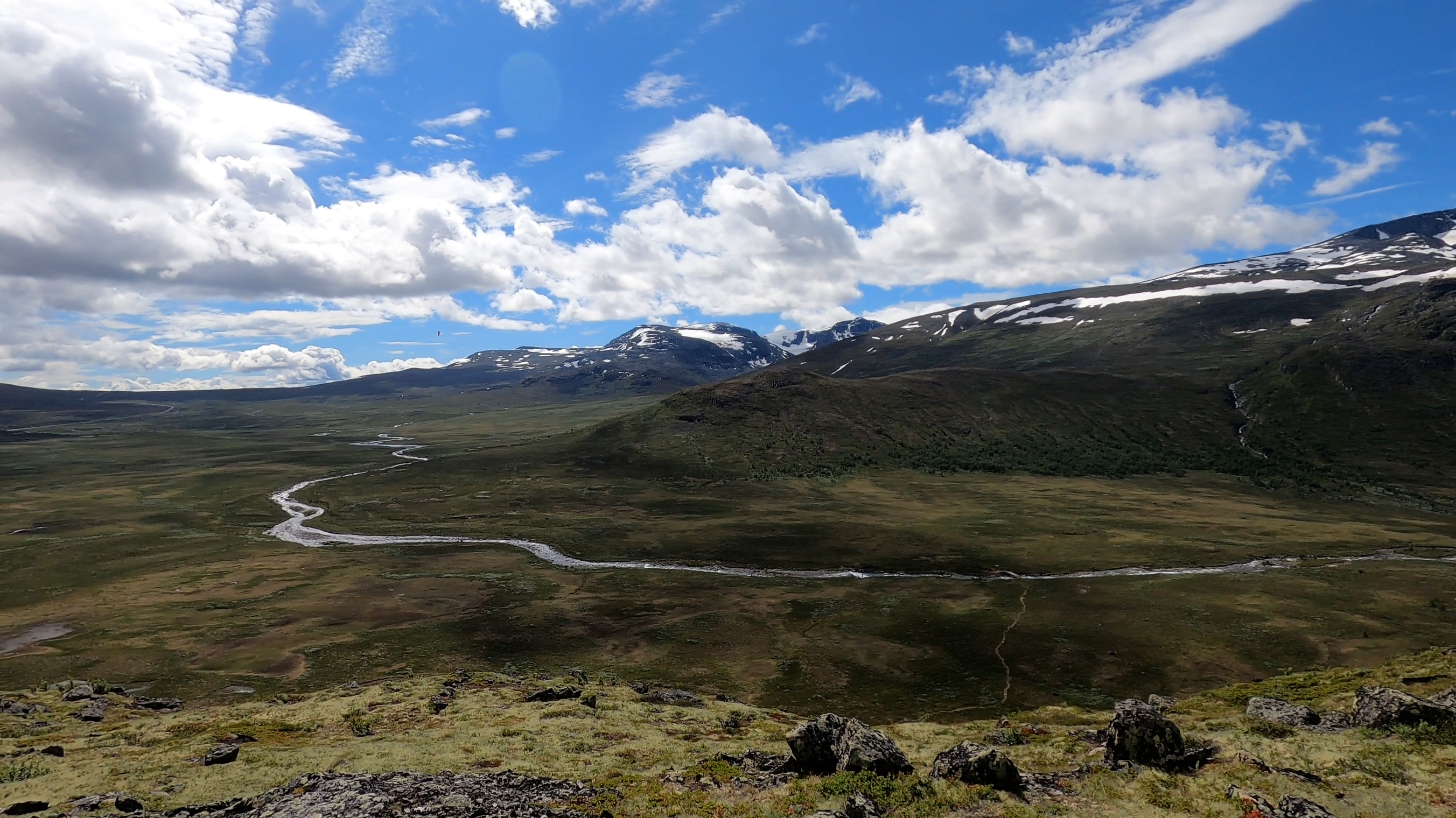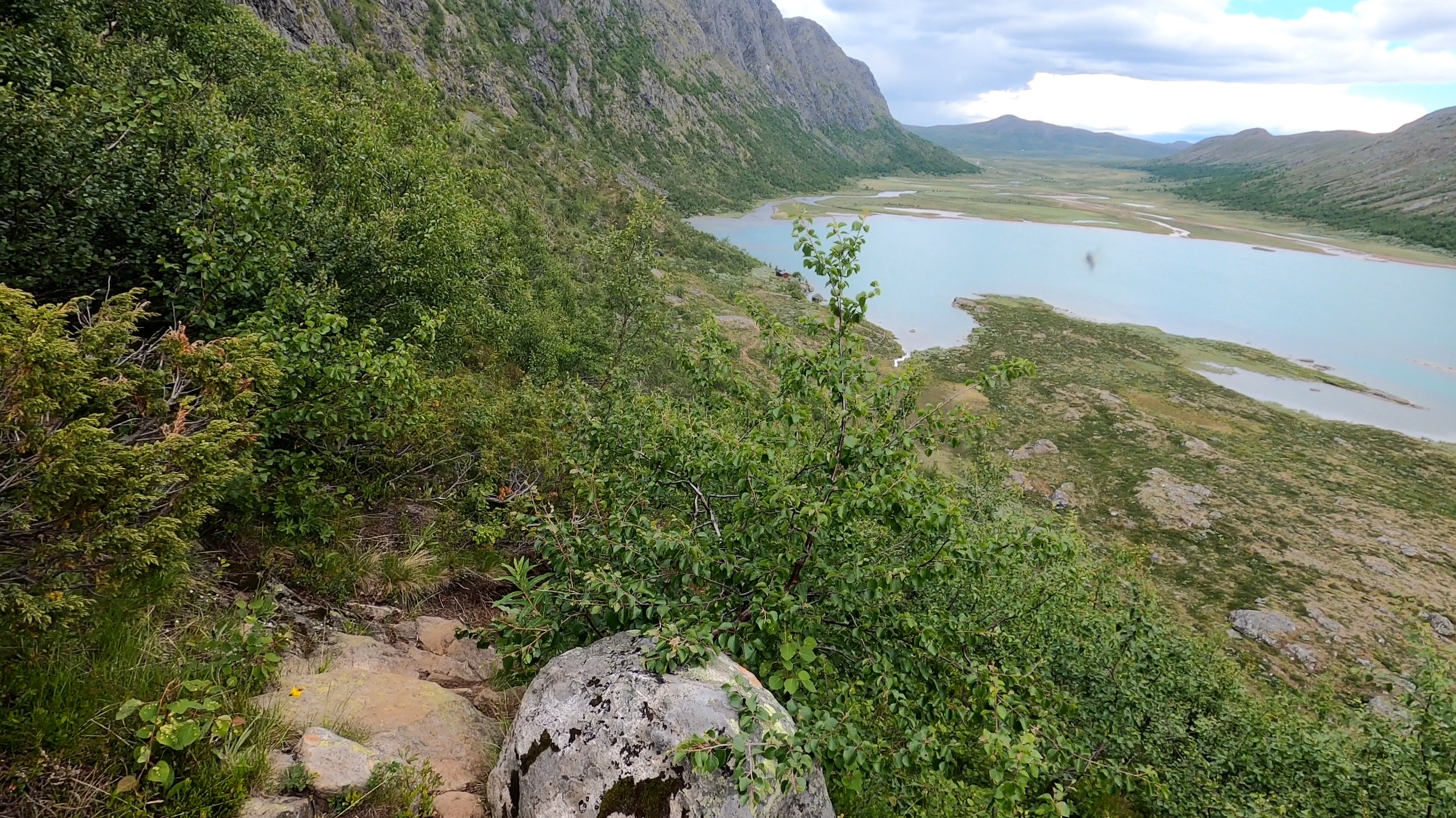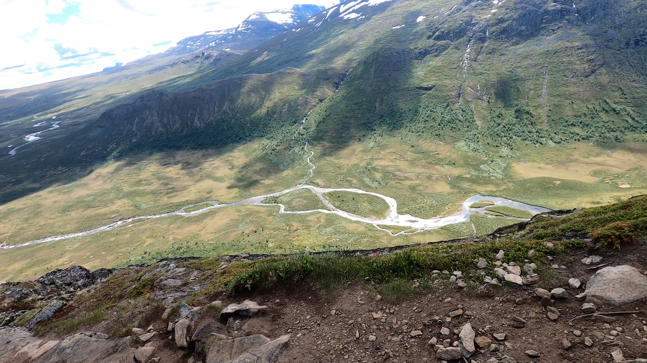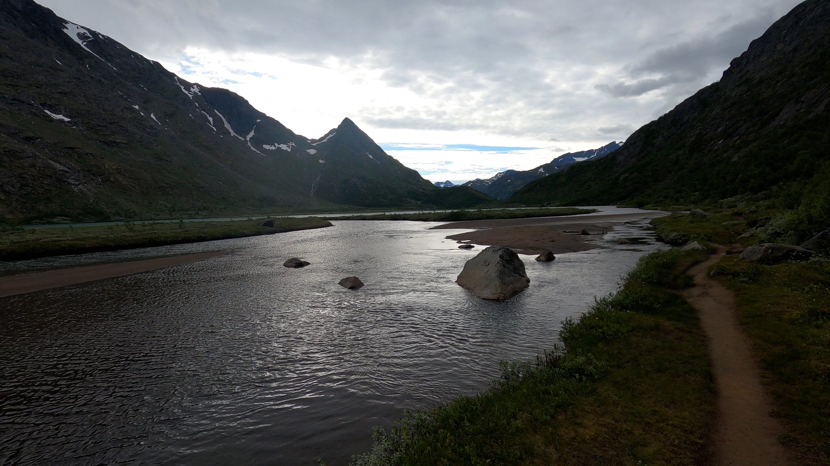 Kulisse sich fortzubewegen. Langsam schlängelte sich dieser Weg am Bergrücken Knutshoe entlang eines Sees und ausgedehnten Flußbetts Richtung Ausgangspunkt. Zwischendurch ging es durch kurze