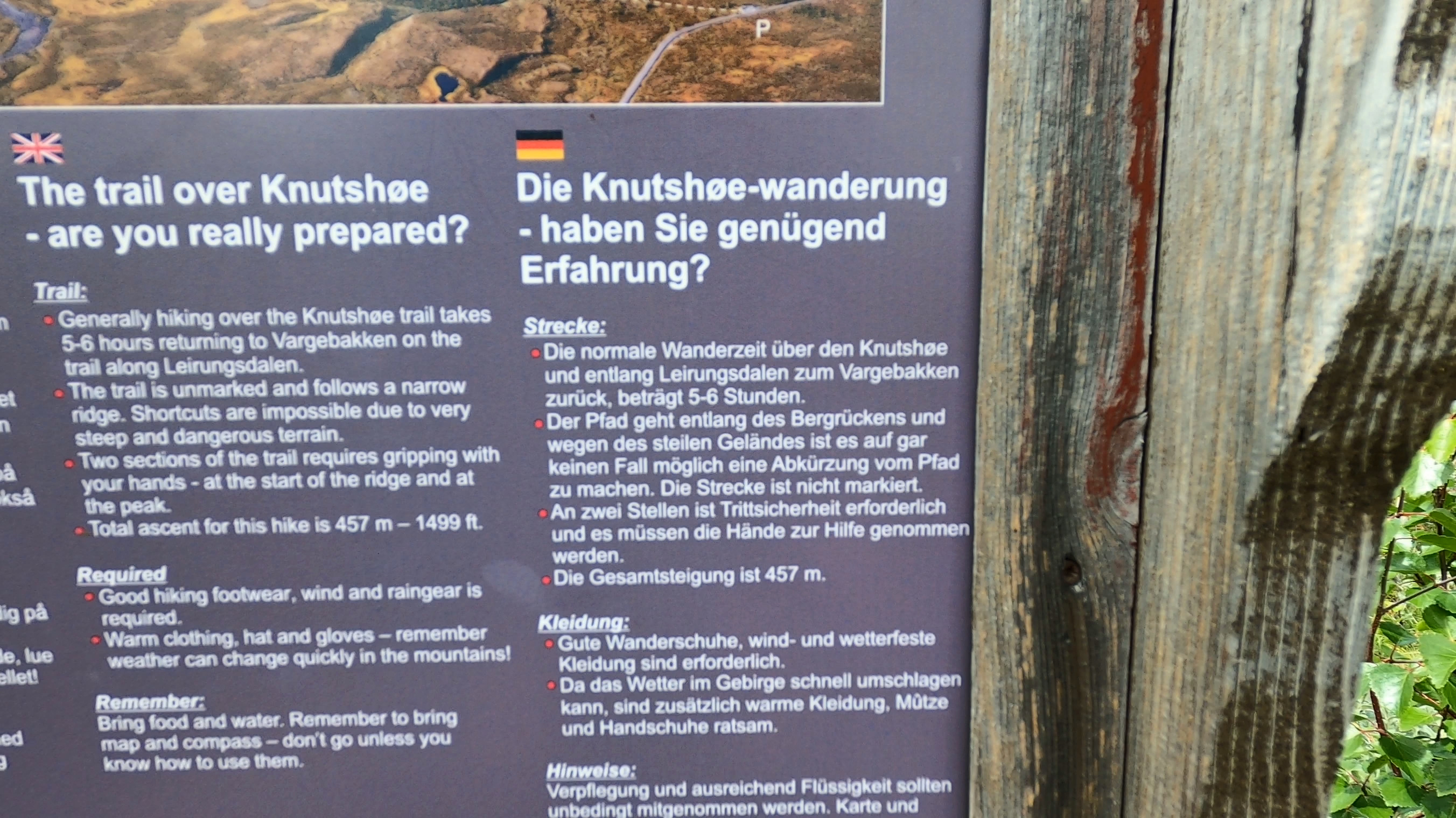 Ein steiniger schmaler Weg führte mich ein wenig bergab, ich musste eine kleine Holztreppe überqueren, weiter ging es über eine Brücke die über einen Fluß führte und da war ich auch schon am Knutshoe angekommen. Ich hatte schon einigen Respekt vor dieser Tour bekommen und machte mich weiter auf den Weg, auch weil man auf einer Tafel im Vorfeld gefragt wurde ob man auch wirklich fit genug für diese Tour sei.
