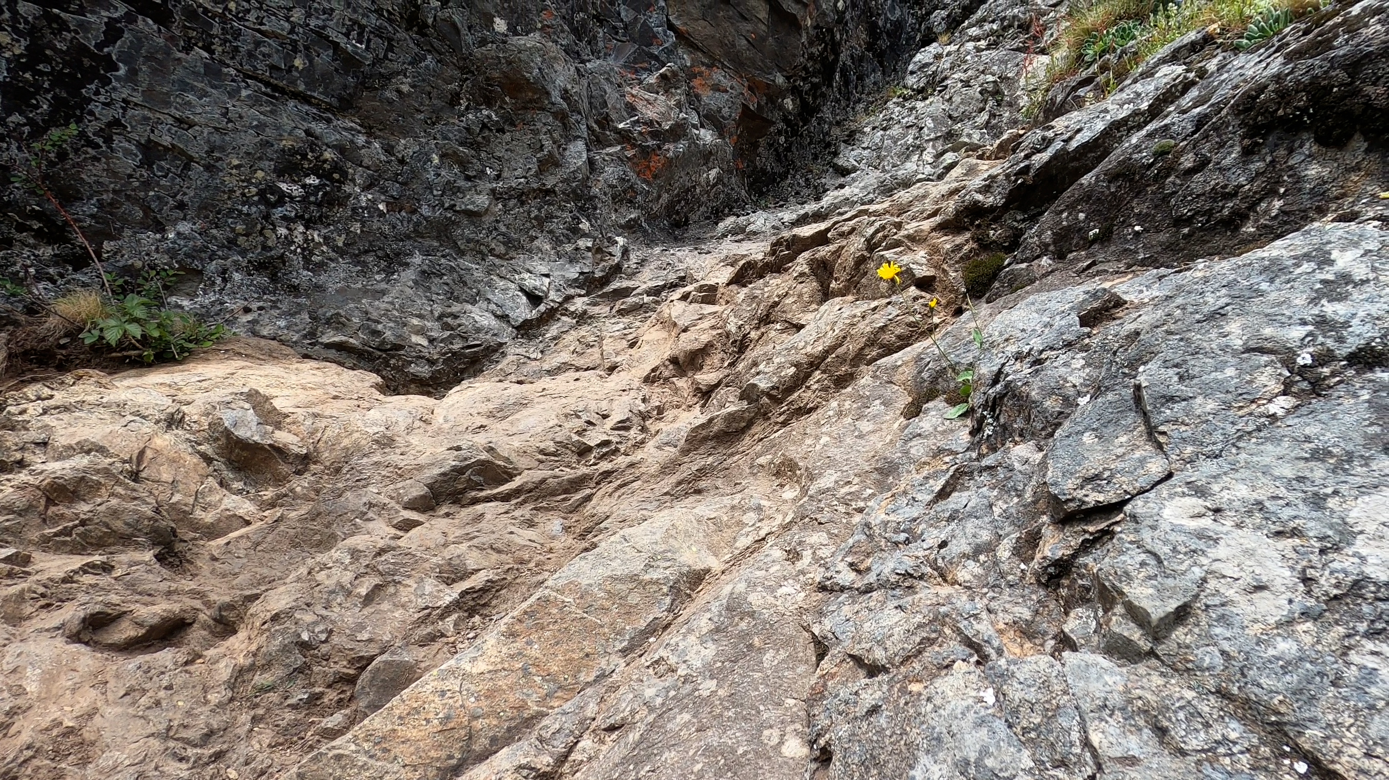 Vor mir lag eine mehr oder weniger senkrechte Kletterwand von wenigen Metern Höhe, die aber erstmal überwunden werden musste. Und da war nichts zum absichern oder zum umgehen, hier musste man hinauf, im Klettermodus. Oder man kehrte wieder um, wenn man es sich nicht zutraute.